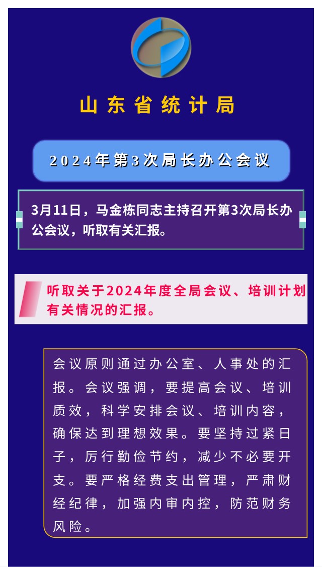会议内容:3月11日,马金栋同志主持召开第3次局长办公会议,听取办公室、人事处关于2024年度全局会议、培训计划有关情况的汇报。