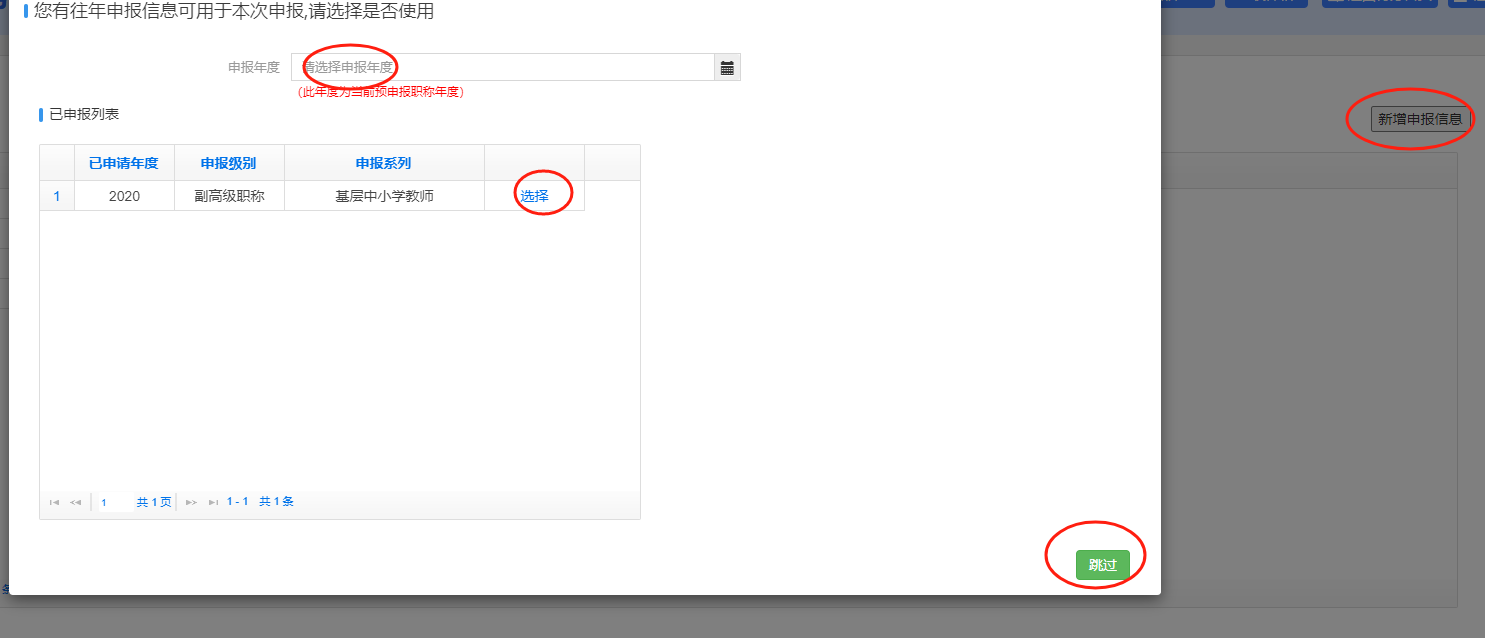 2.新增申报信息:请选择是否采用往年申报信息,若是,请填写本次申报年度,并选择一条往年信息;若否,点击‘跳过’重新填写。
