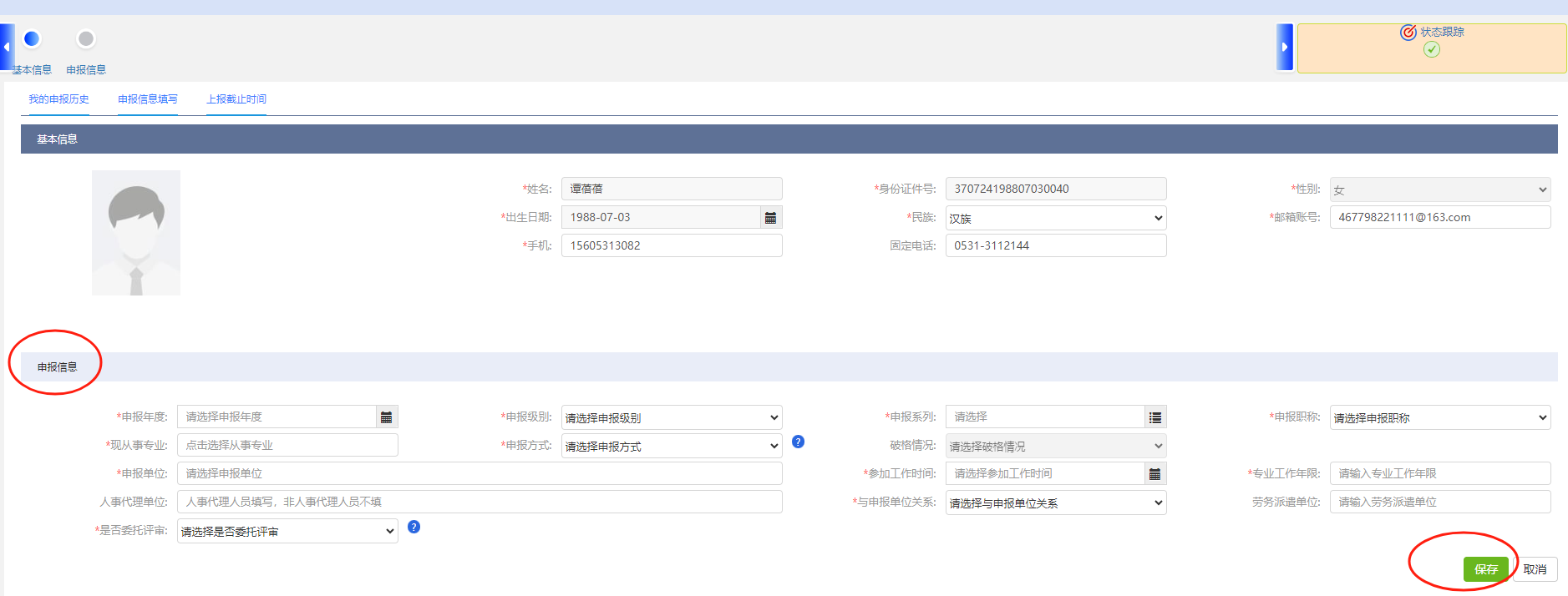 3.填写基本信息:请核对姓名、身份证号、联系方式等信息准确无误,并填写‘申报信息’。注意,同一年度‘职称申报’和‘考核认定’只能选择一项填写。完成后保存。若个人姓名注册错误,在保存申报信息后,可点击右上角“电子身份证照核验”进行比对修改。
