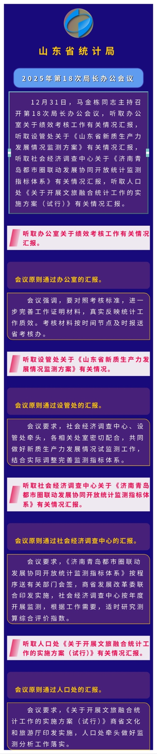 会议时间:2025年12月31日 会议内容:12月31日,马金栋同志主持召开第18次局长办公会议,听取办公室关于绩效考核工作有关情况汇报,听取设管处关于《山东省新质生产力发展情况监测方案》有关情况汇报,听取社会经济调查中心关于《济南青岛都市圈联动发展协同开放统计监测指标体系》有关情况汇报,听取人口处《关于开展文旅融合统计工作的实施方案(试行)》有关情况汇报。 会议强调,要对照考核标准,进一步完善工作证明材料,坚持实事求是,不夸大成绩,不回避问题,真实反映统计工作质效。考核材料按时间节点及时报送省考核办。 会议要求,社会经济调查中心、设管处牵头,各相关处室密切配合,共同做好新质生产力发展情况试监测工作,结合实际调整完善监测指标体系。 会议要求,《济南青岛都市圈联动发展协同开放统计监测指标体系》按程序送有关部门会签,商省发展改革委联合印发实施,社会经济调查中心按年度开展监测,根据工作需要,适时研究测算综合评价指数。 会议要求,《关于开展文旅融合统计工作的实施方案(试行)》商省文化和旅游厅印发实施,人口处牵头做好监测分析工作落实。 纪要图解: | ||||