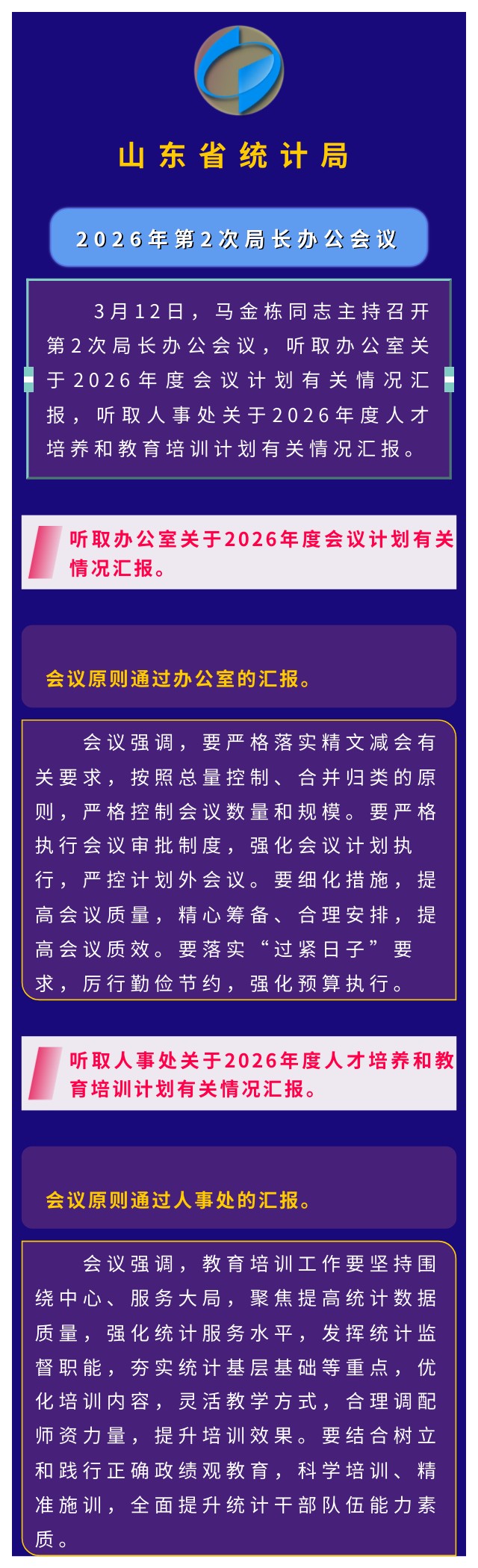 会议时间:2026年3月12日 会议议题:3月12日,马金栋同志主持召开第2次局长办公会议,听取办公室关于2026年度会议计划有关情况汇报,听取人事处关于2026年度人才培养和教育培训计划有关情况汇报。 会议原则同意办公室的汇报。 会议强调,要严格落实精文减会有关要求,按照总量控制、合并归类的原则,严格控制会议数量和规模。要严格执行会议审批制度,强化会议计划执行,严控计划外会议。要细化措施,提高会议质量,精心筹备、合理安排,提高会议质效。要落实“过紧日子”要求,厉行勤俭节约,强化预算执行。 会议原则同意人事处的汇报。 会议强调,教育培训工作要坚持围绕中心、服务大局,聚焦提高统计数据质量,强化统计服务水平,发挥统计监督职能,夯实统计基层基础等重点,优化培训内容,灵活教学方式,合理调配师资力量,提升培训效果。要结合树立和践行正确政绩观教育,科学培训、精准施训,全面提升统计干部队伍能力素质。 纪要图解: | ||||